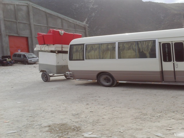 Tons and tons of relief supplies and materials pass through every day. Here is a bus with a trailer full of goods on its way into Haiti.