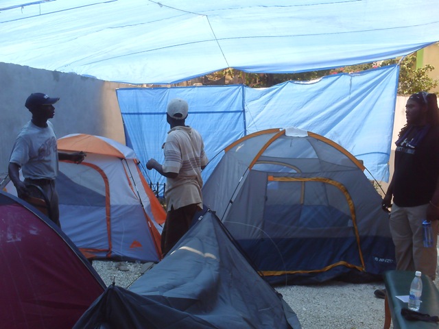 AUMOHD’s headquarters in the Delmas neighborhood of Port-au-Prince, rented with funds donated by HURAH supporters, survived the earthquake largely intact, and has become a hub of relief activity. Its courtyards are now filled with tents, tarps and relief workers from several different groups, including members of the American Center for International Labor Solidarity (ACILS), an international labor organization affiliated with the AFL-CIO.